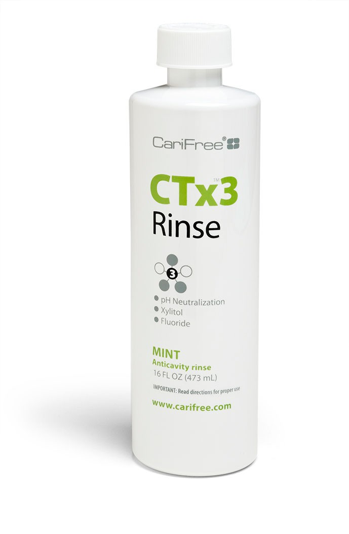 Carifree CTx3 Rinse is a “mouthwash” type product that you use once a day before going to bed. While your mouth becomes dried out during the night, CTx3 rinse provides a whole spectrum of benefits to combat potential decay. Firstly, it’s pH neutral formula prevents extreme acidic events. Essentially, your mouth is protected from a low pH environment, which can soften tooth structure and erode enamel. Secondly, it contains a therapeutic dose of xylitol, a natural plant derived sugar. When your mouth bacteria metabolize xylitol, their acid production is limited or stopped. Additionally, xylitol can stimulate saliva flow, which is excellent for combatting almost every facet of decay. Finally, the CTx3 contains fluoride, a carrier ion that helps calcium phosphate integrate and remineralize existing tooth structure.