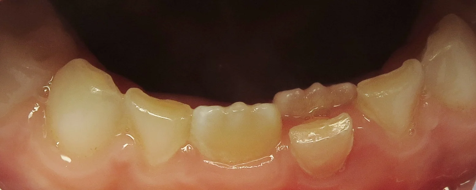 Today's case is a great example of the importance of color and translucency when designing a crown or veneer in the anterior region. This patient came to our office dissatisfied with their current dental restorations and overall smile esthetics. The crowned teeth appeared unnaturally opaque and presented with a sharp change in color where the teeth met the gum tissue. These crowns were created using porcelain fused to metal (PFM), a classic technique for fabricating tooth colored crowns. While they make very functional restorations, PFMs take away from the natural translucency of teeth due to their solid metal underpinnings. This patient's condition was exacerbated by gingival recession, which revealed contrasting natural tooth structure underneath the crown.
